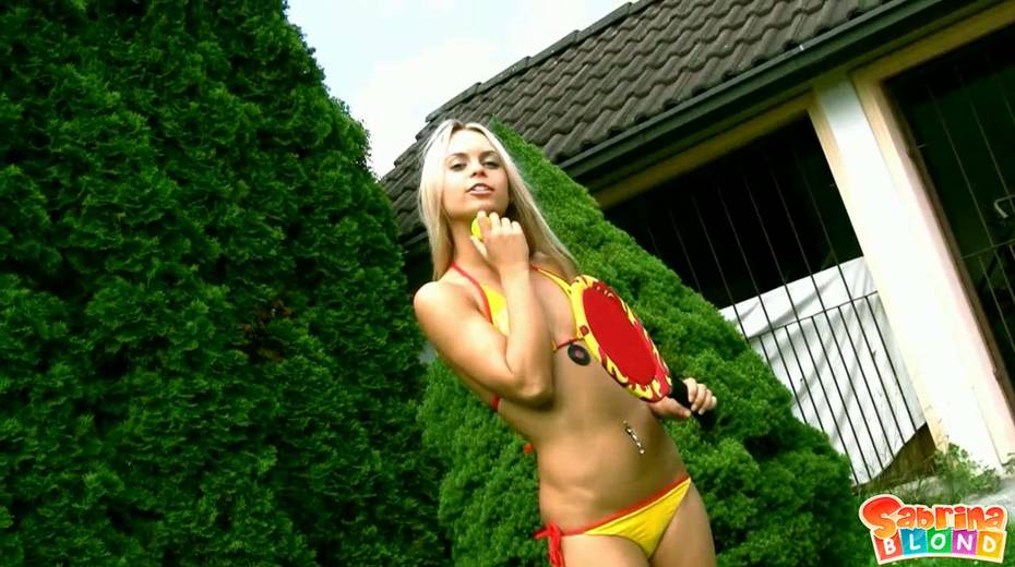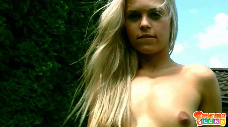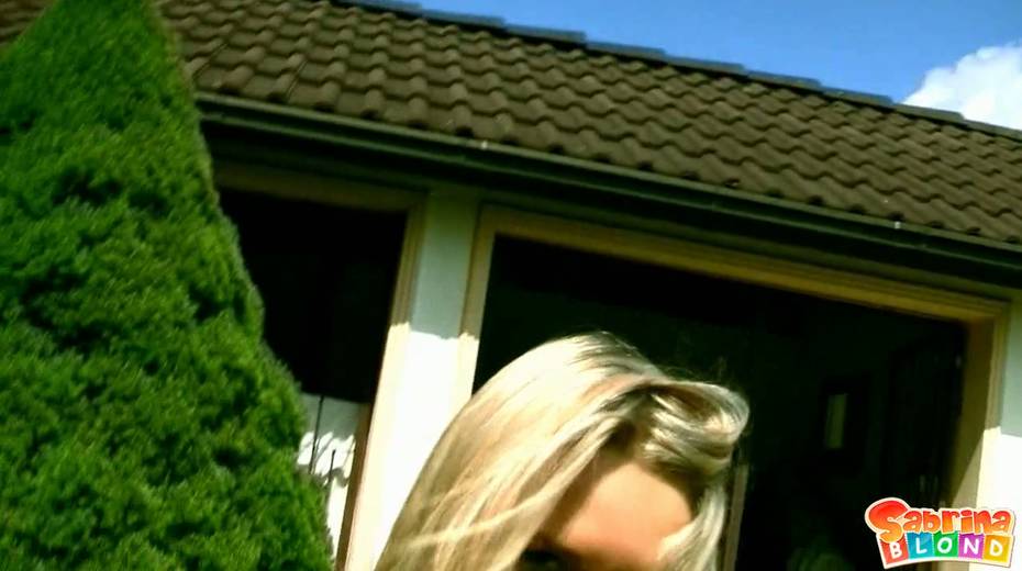 Naughty blond teen Sabrina Blond is playing with her smooth pussy on the lawn