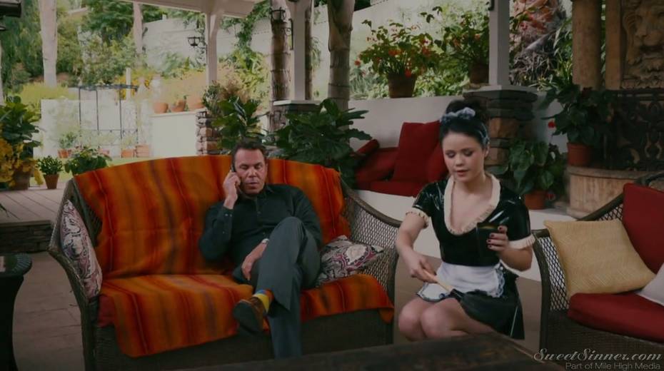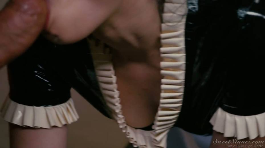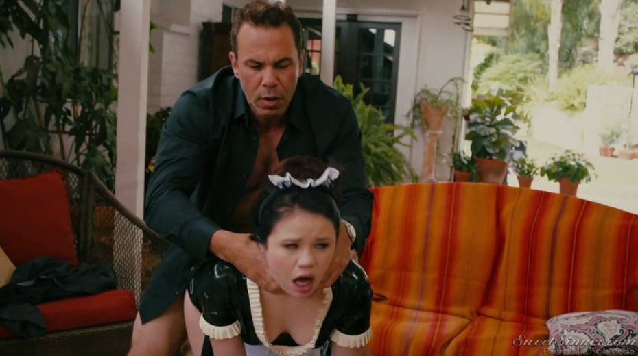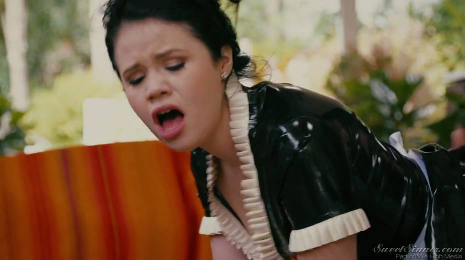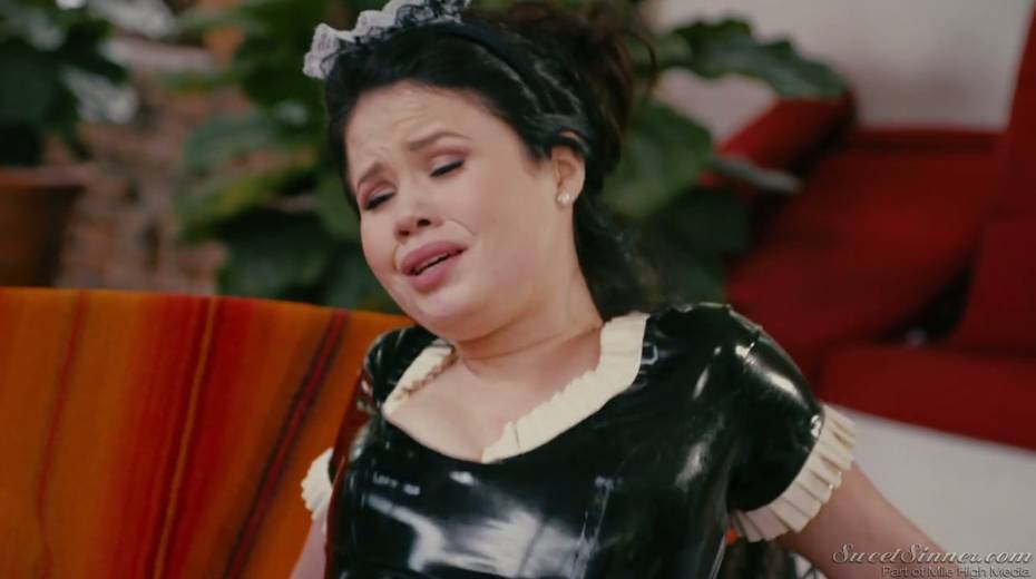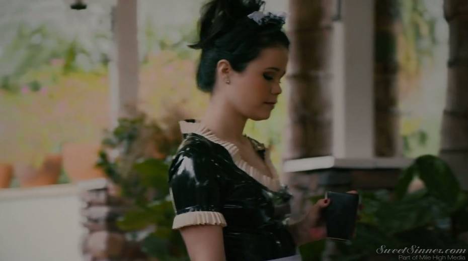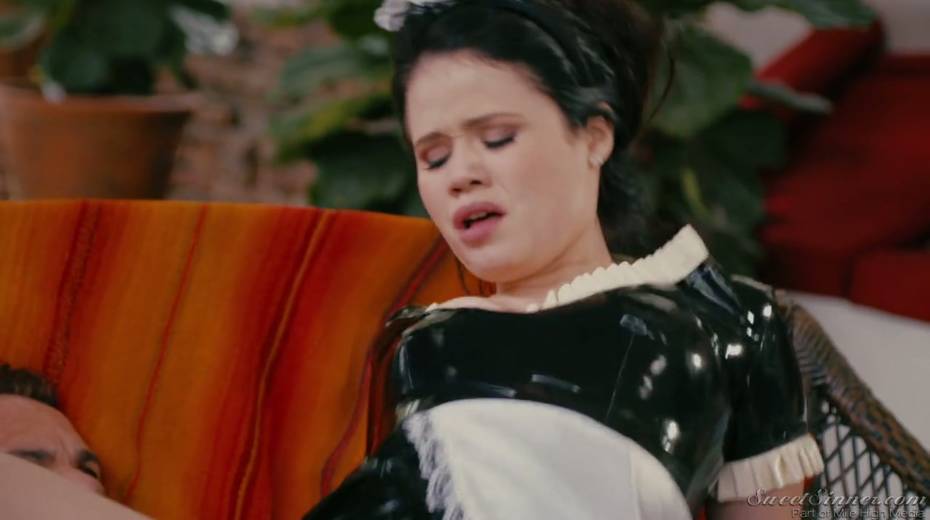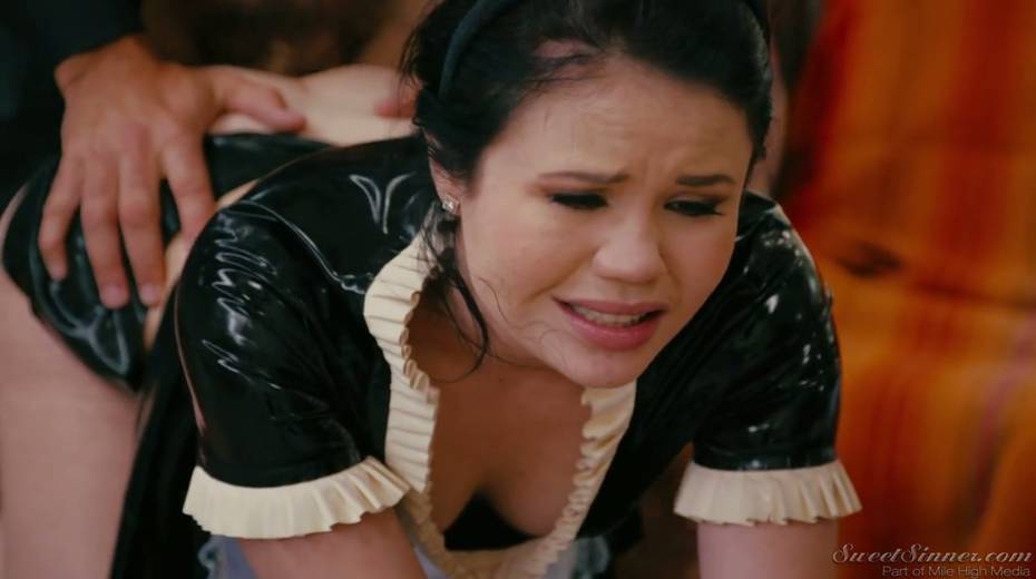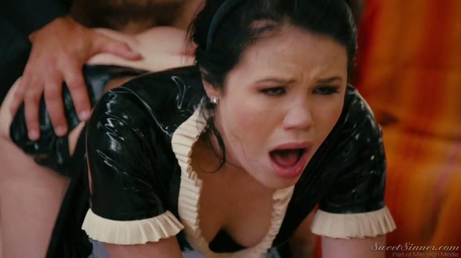 Cute petite brunette in sexy maid uniform Yhivi gives blowjob and gets her slit rammed