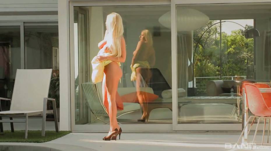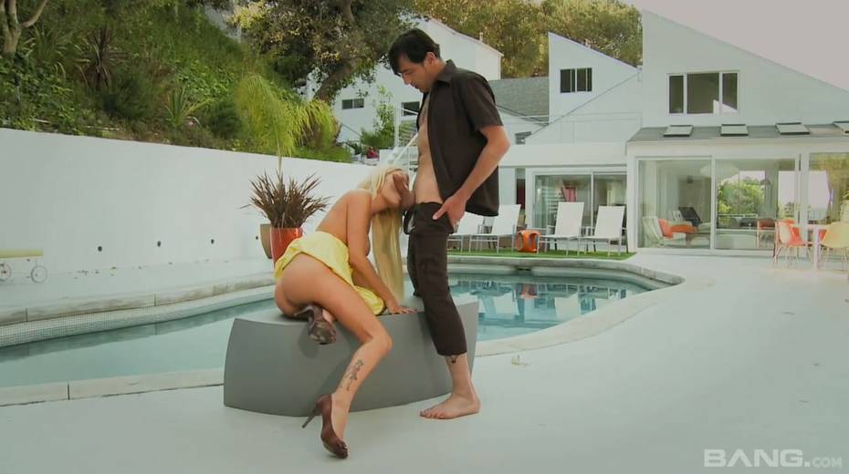 Stunning blond babe Riley Evans guzzles hard pole and gets her slit fucked by the pool side