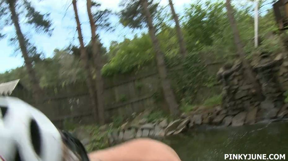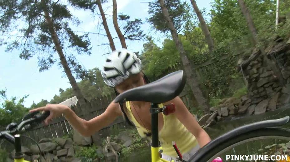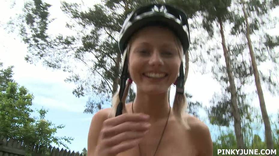 Young blonde is riding her bicycle and masturbating pussy outdoor