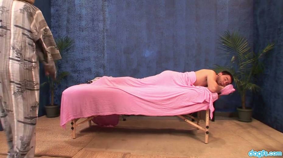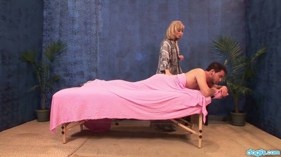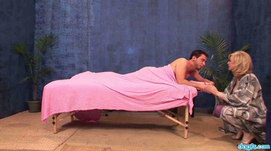 Captivating cougar Nina Hartley gives massage to one handsome client