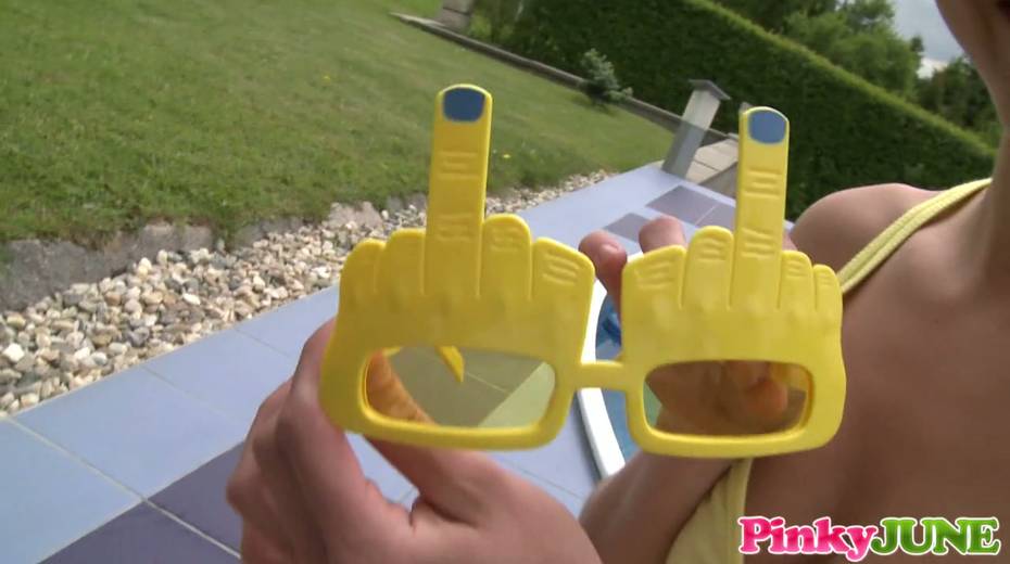Sexy nympho Pinky June is playing with her punani by the poolside