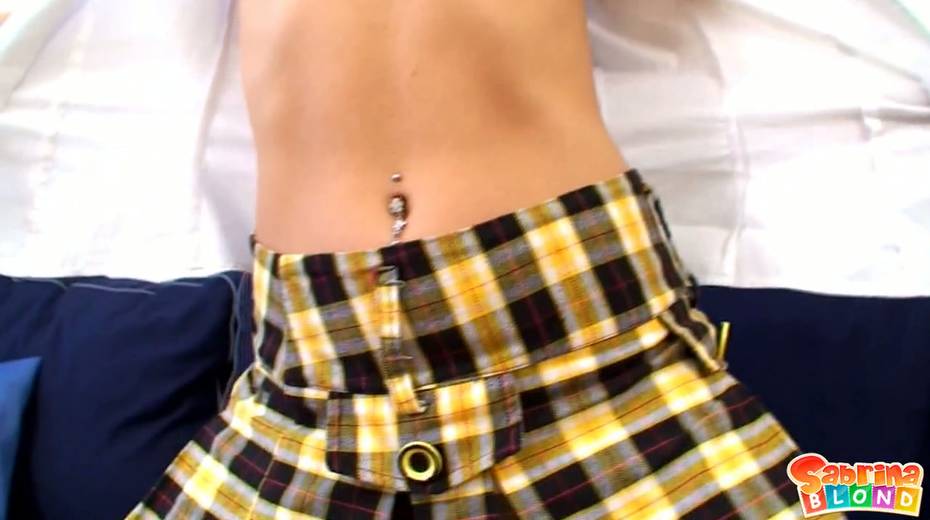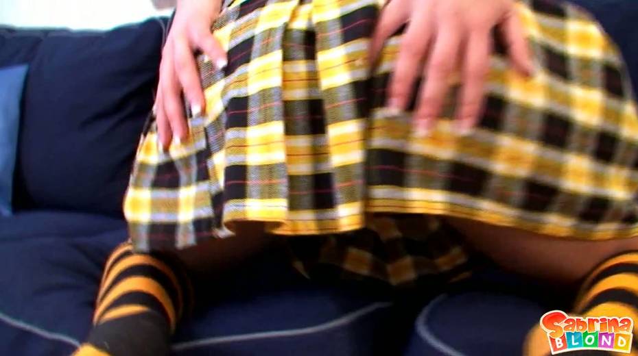Cute blonde in short kilt skirt Sabrina Blond is playing with her pussy