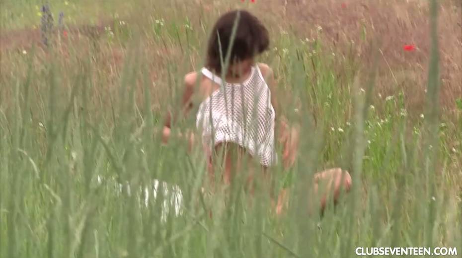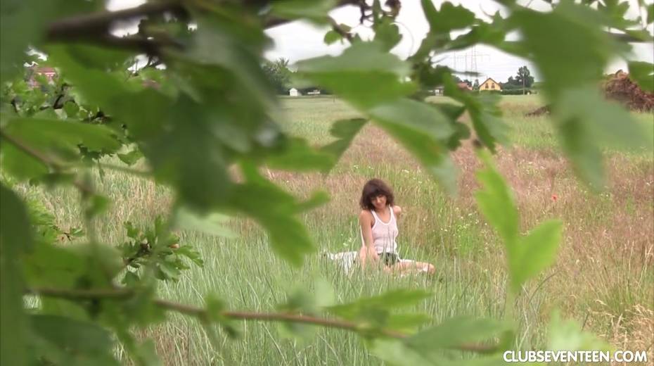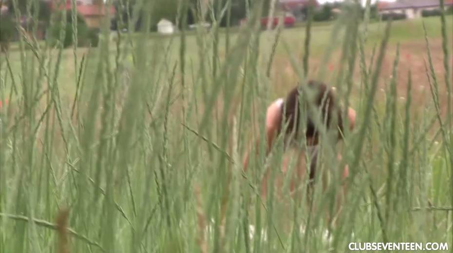 Cute teen Suzy Rainbow is toying her fresh looking pussy in a meadow