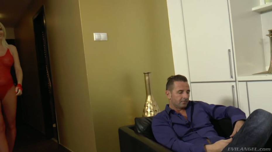 Sassy blonde in red body fishnet Lili A seduces boyfriend of her best girlfriend