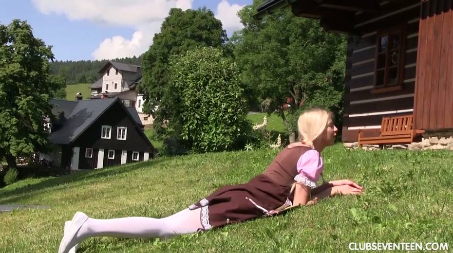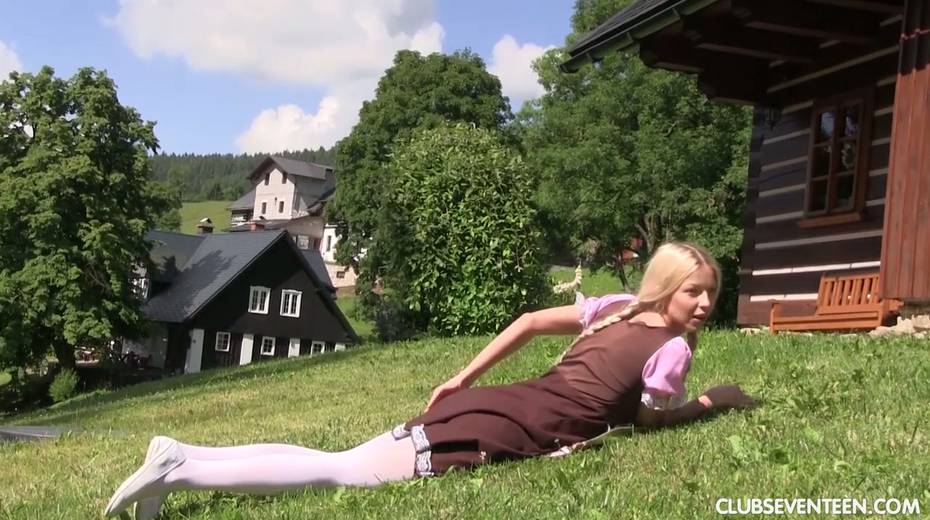 Seductive blond babe with pigtails Karol Lilien masturbates muff on the lawn