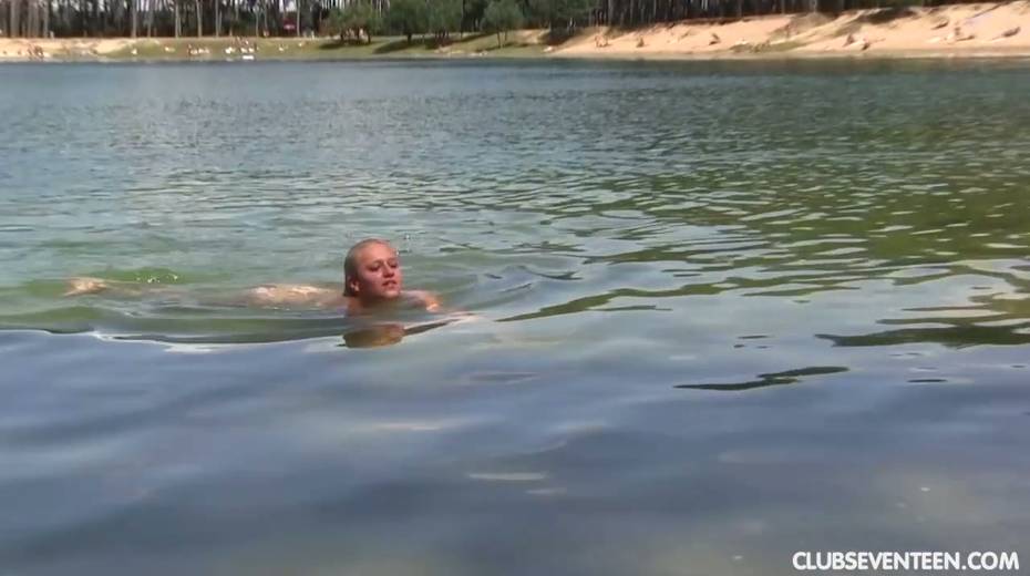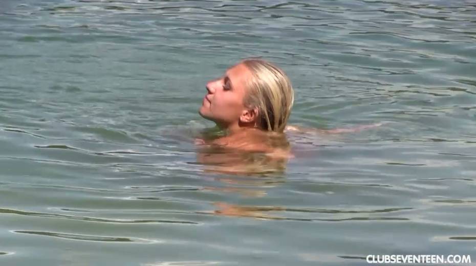 Slender blonde with perky nipples Sara J is playing with her pussy outdoor