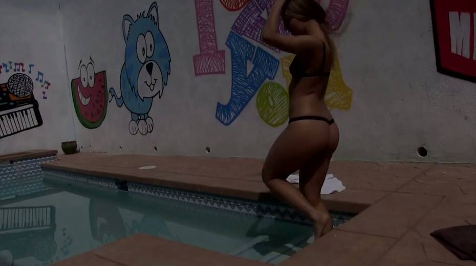 Sex-hungry tanned babe Candice Dare rides dick by the pool side