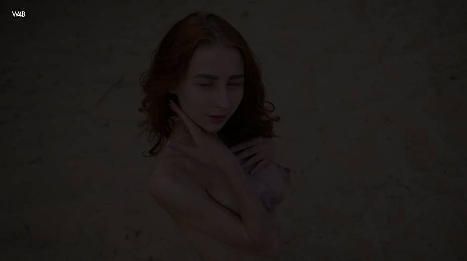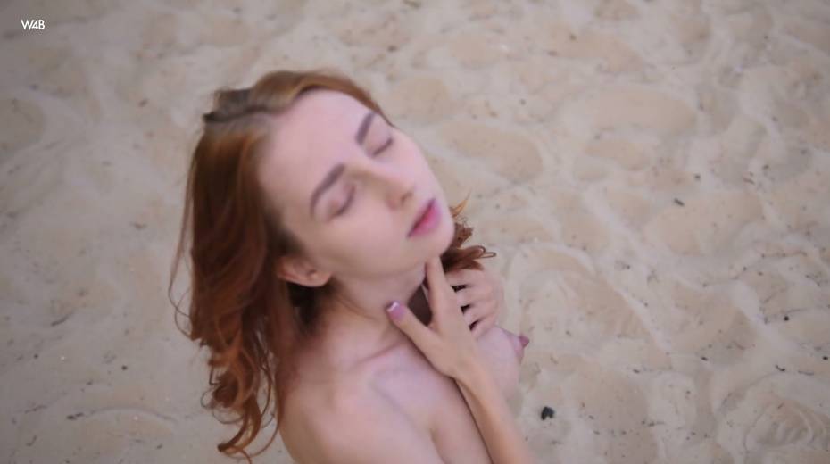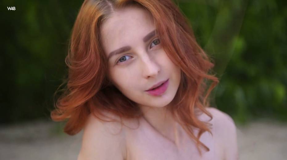 Busy petite ginger porn model Helga Grey is posing on the beach