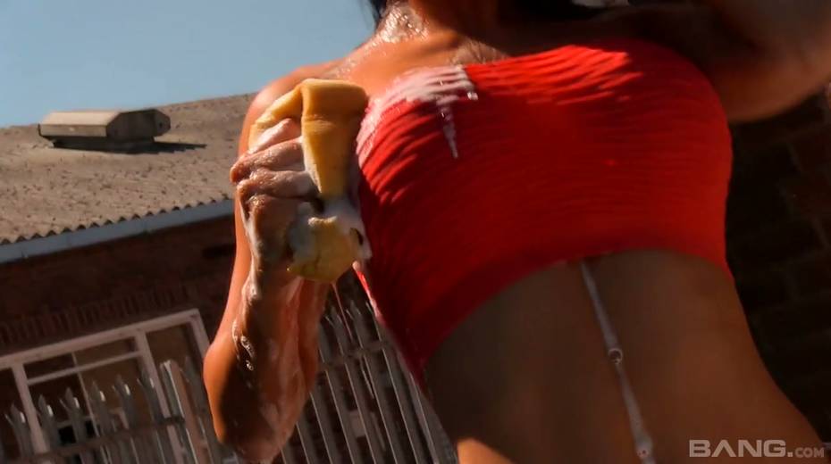 Bitch with pierced pussy Jasmine Jae is washing a car and having dirty outdoor quickie