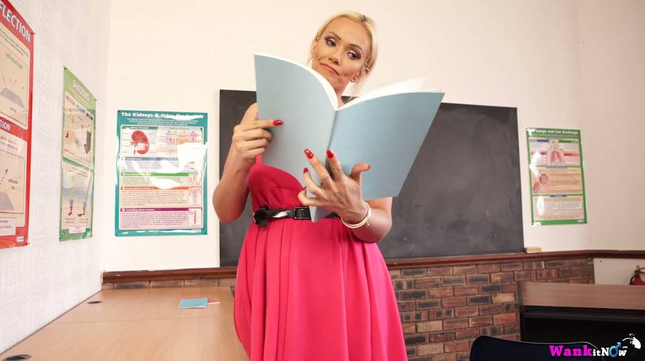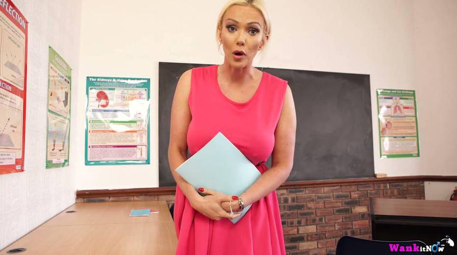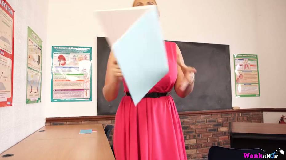 Sexy teacher with massive boobs Lucy Zara plays with her pussy right on the table
