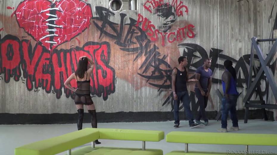 Swanky bitch in fishnets Henessy is fucked by three well endowed black bullies