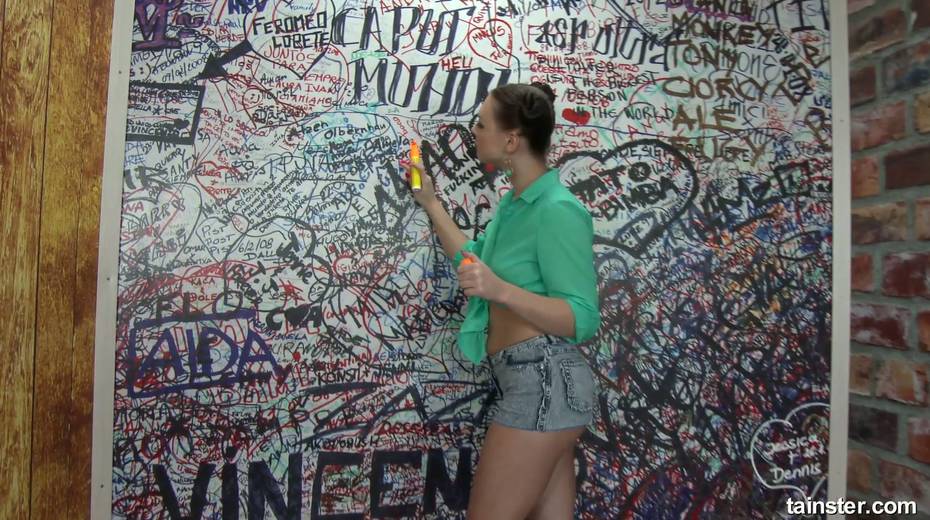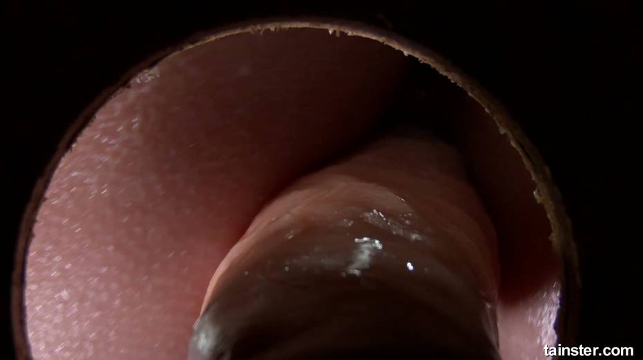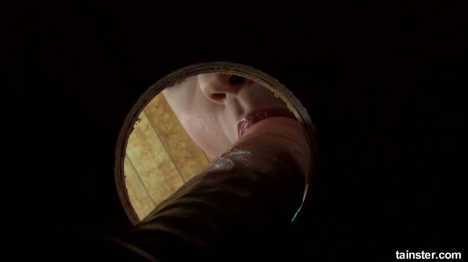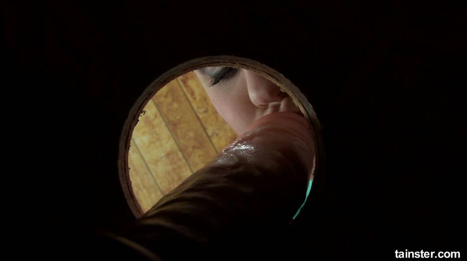 Clothed bitch goes wild in the glory hole room and smears sperm all over her body