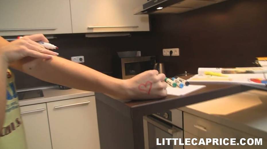 Cute Little Caprice paints with markers on her body and enjoys masturbating her slit