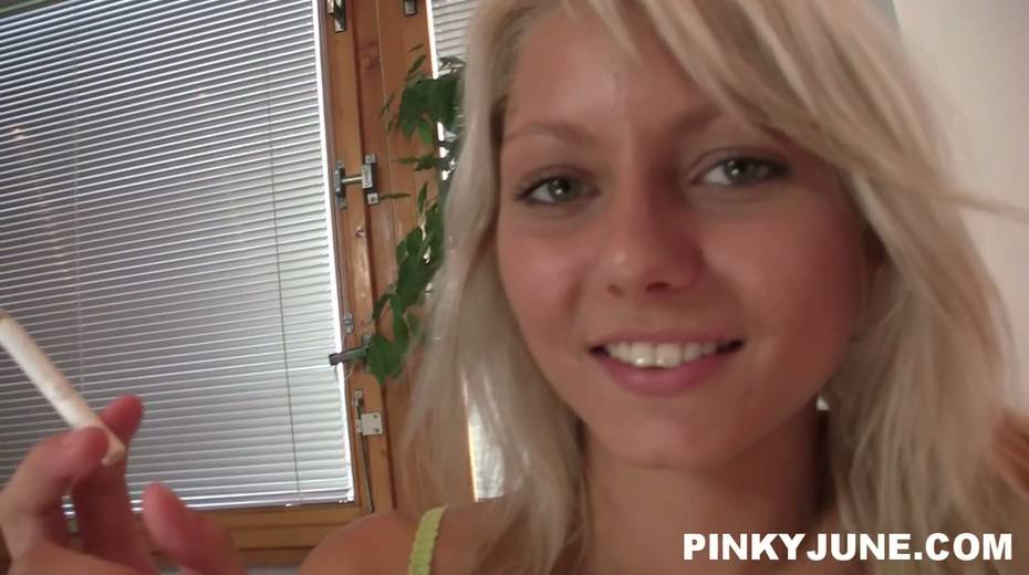 Cute 19 yo blonde Pinky June is toying her sex-hungry punani