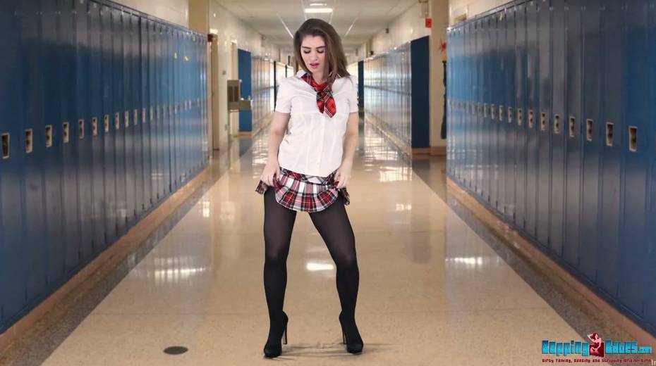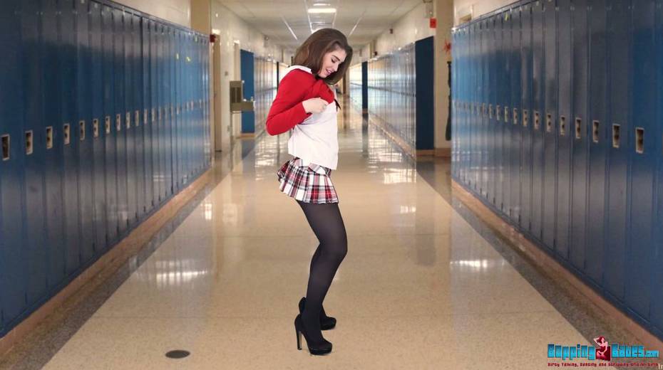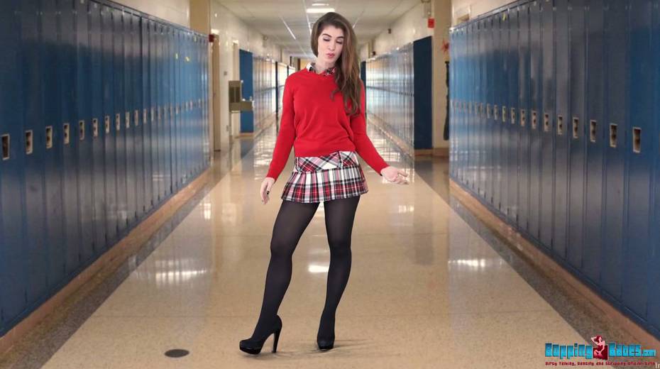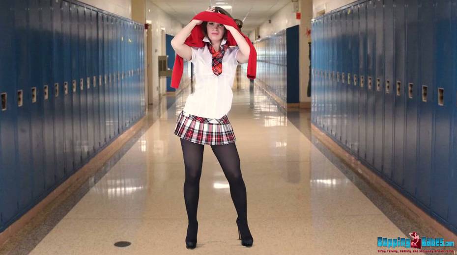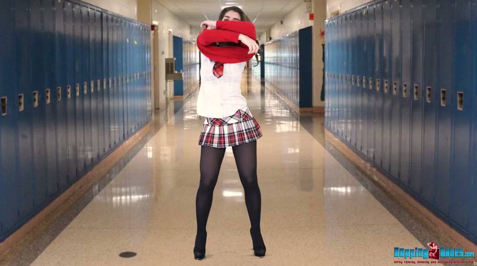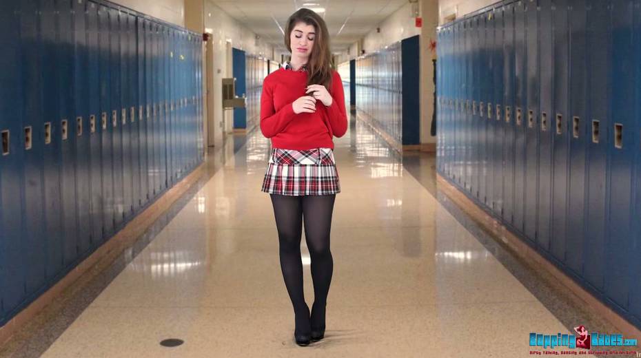Posh college chick in short skirt Katie Louise is stripping in the hall