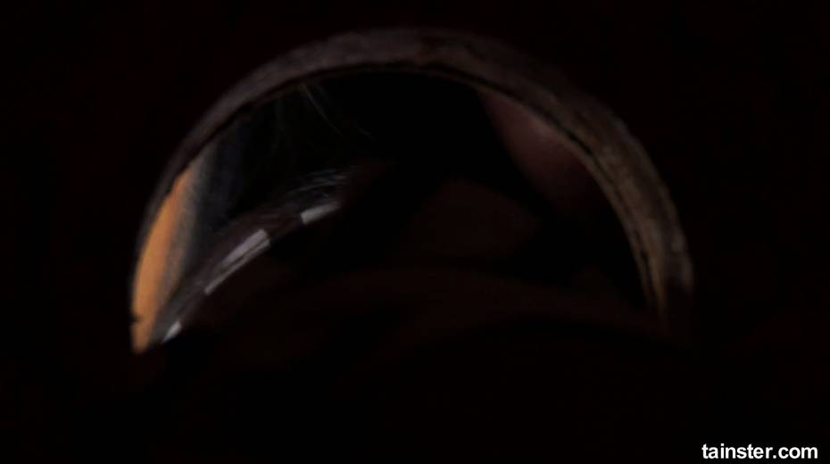Clothed hoochie sucks a big fake dick in the glory hole room