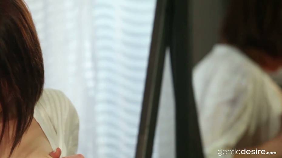 Charming girl Rebecca examines her body and pussy in front of the mirror