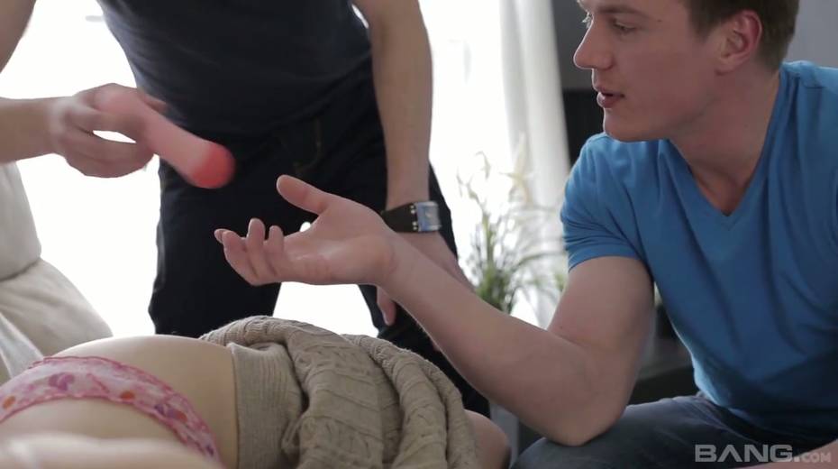 Yummy blonde Madison is fucked hard by two college fellows