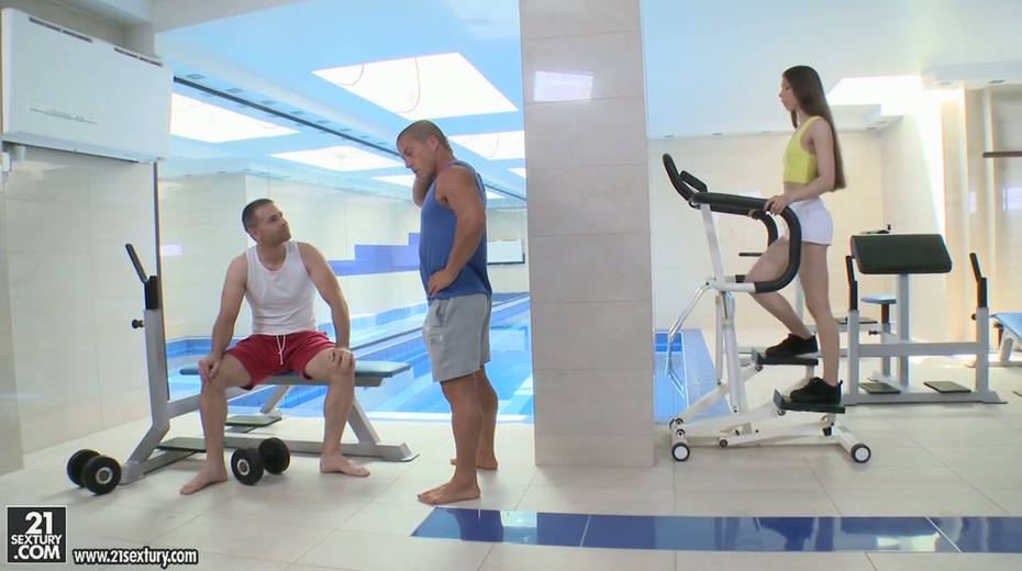 Two hunks fuck charming flat chested babe Stefanie at the gym
