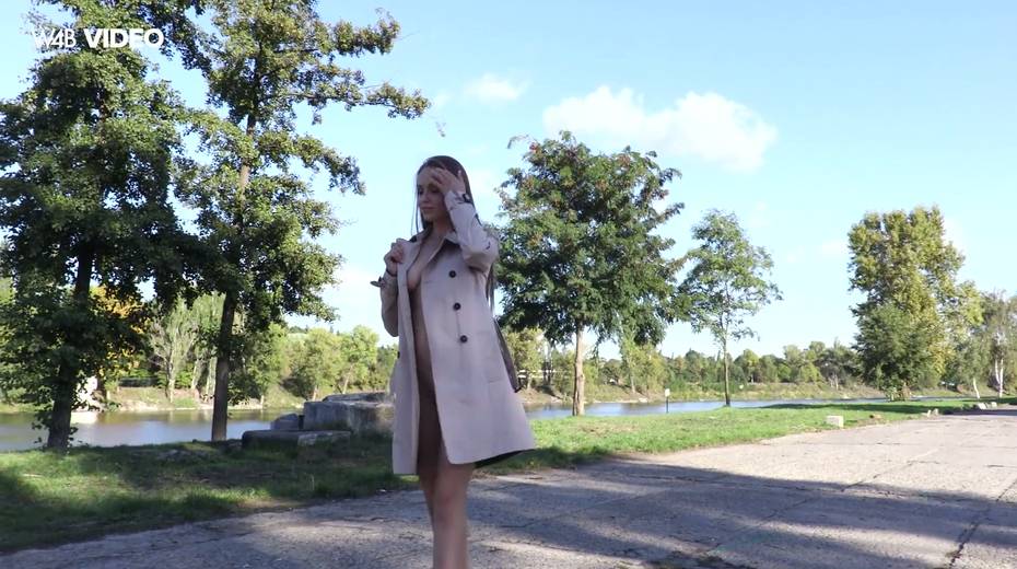 Sweet nude babe wearing only coat Angel B is posing in the street