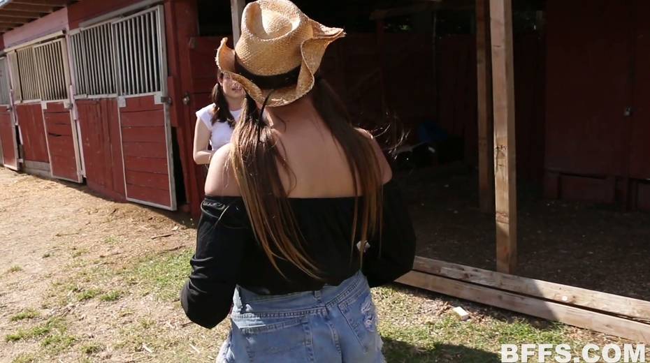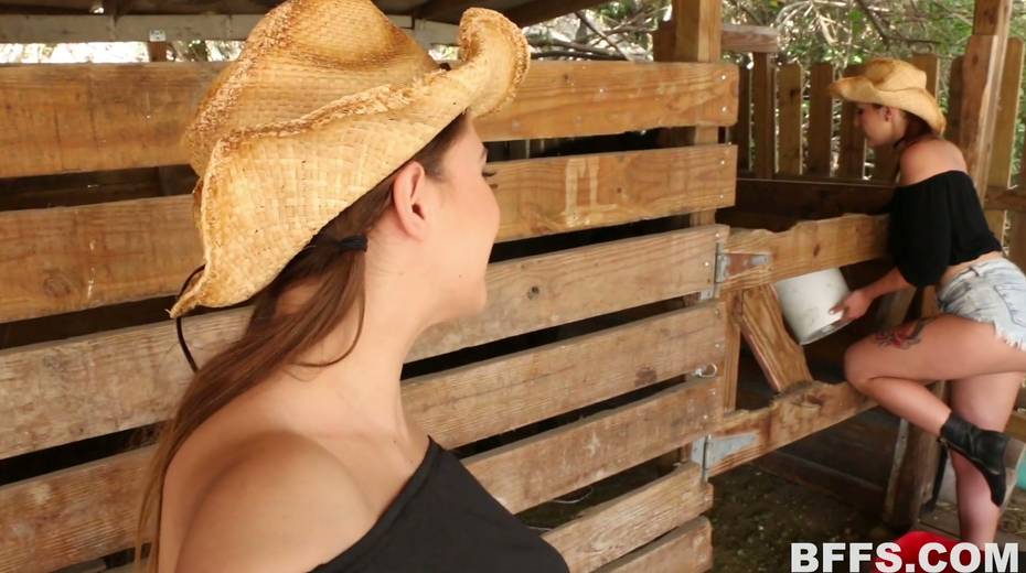 Two country lesbians enjoys licking each others muffs in a stable