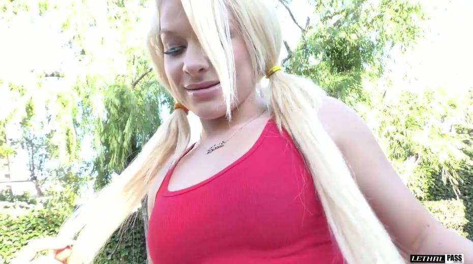 Big bottomed blonde Jenesis Jade is impaled on a hard and meaty pole