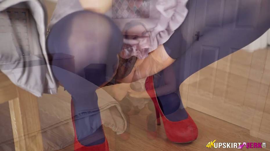 Alluring blonde in short skirt Ashley Jayne shows her pussy upskirt