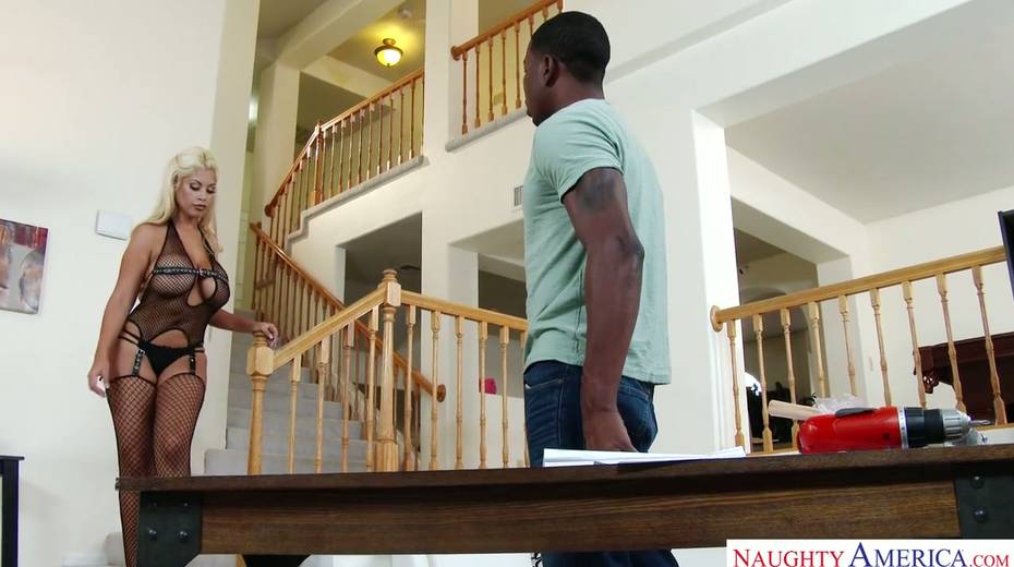 Mega busty blonde Bridgette B enjoys playing with huge black dick and gets her muff rammed