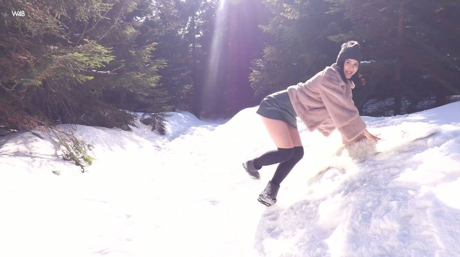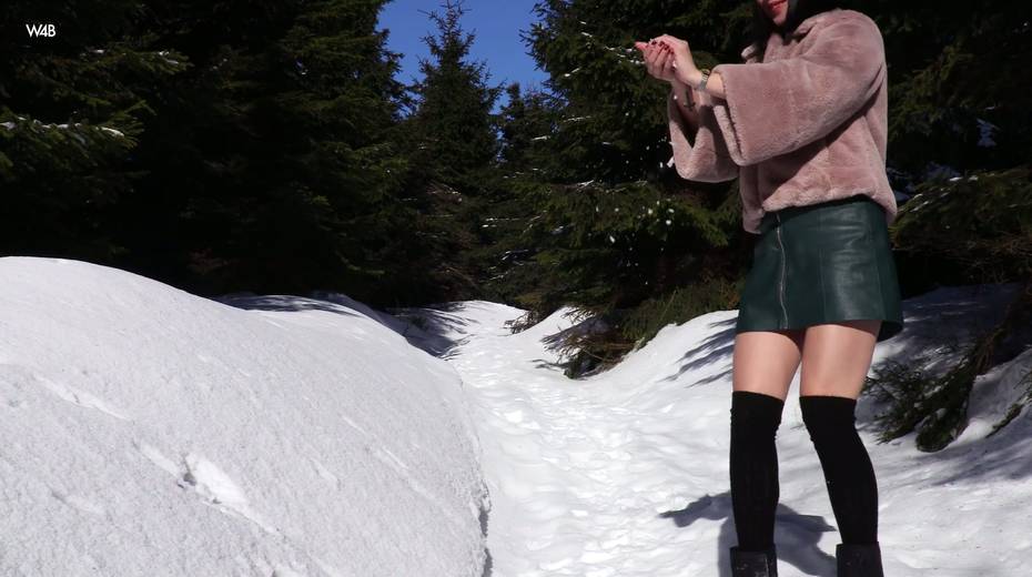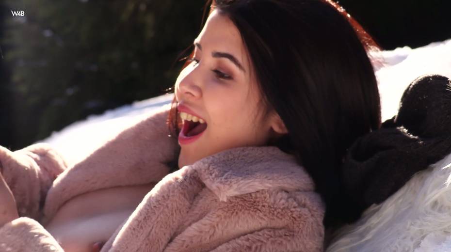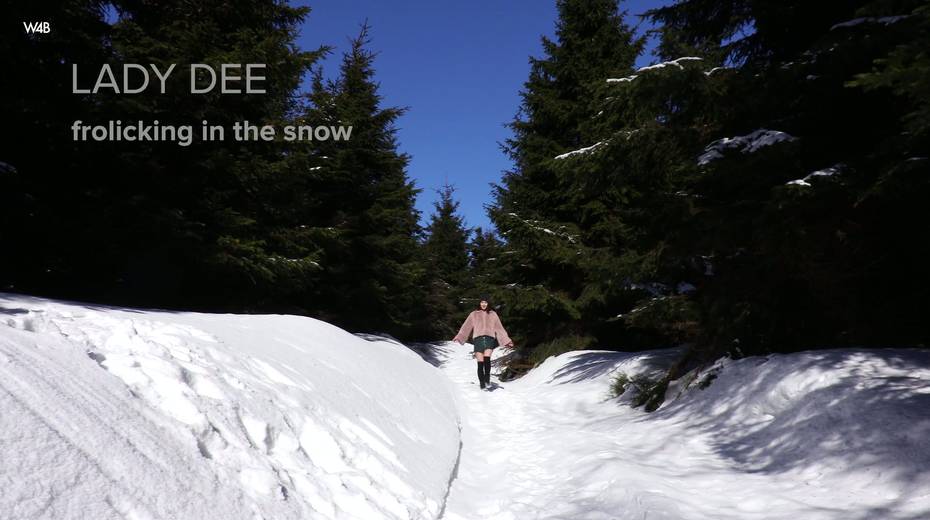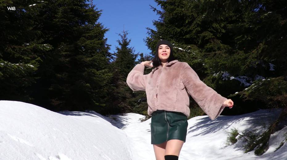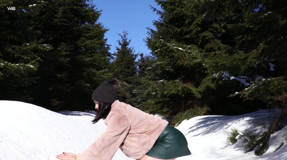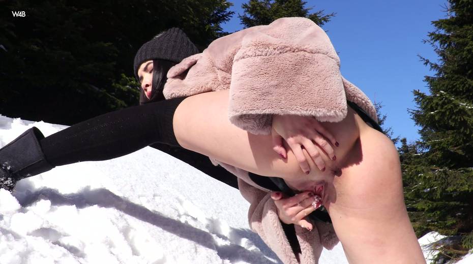 Captivating brunette Lady Dee is playing with her pussy in the snowy mountains