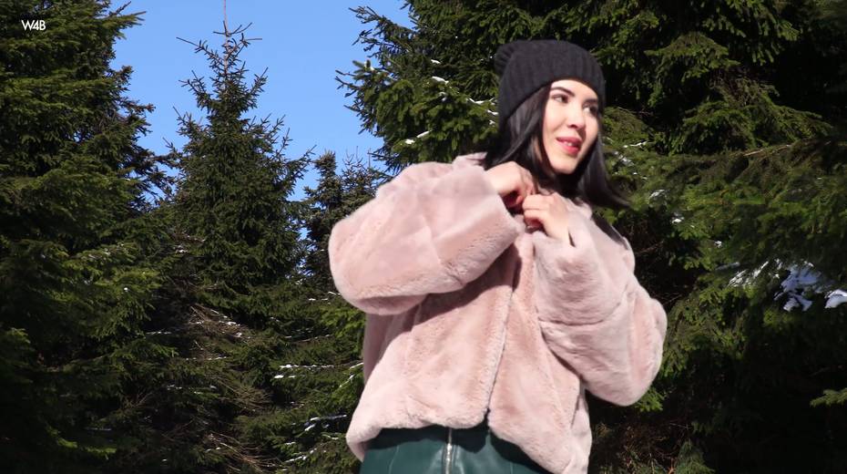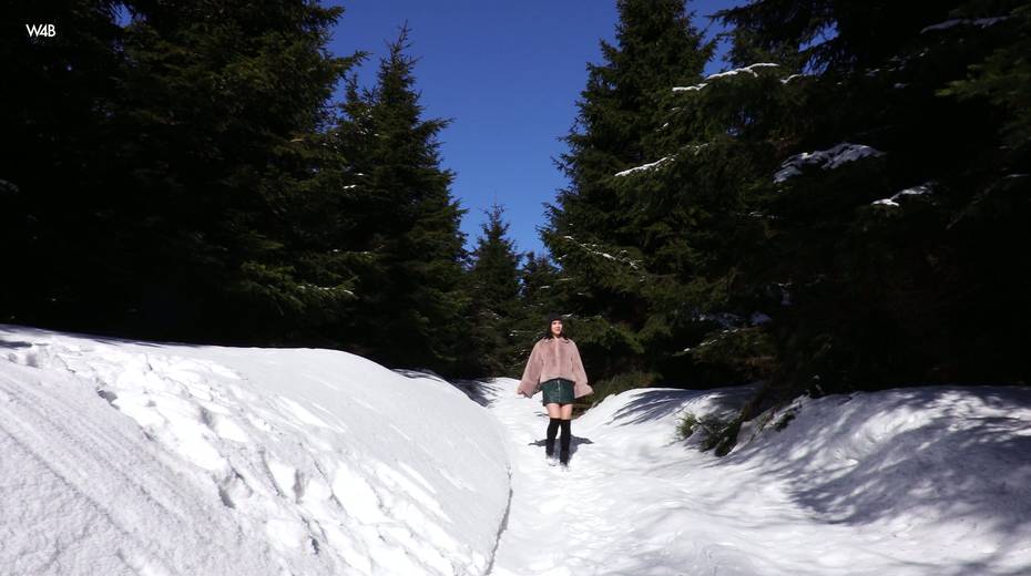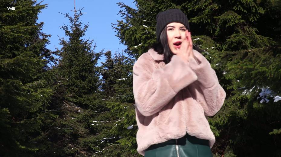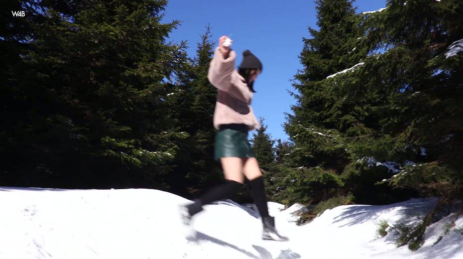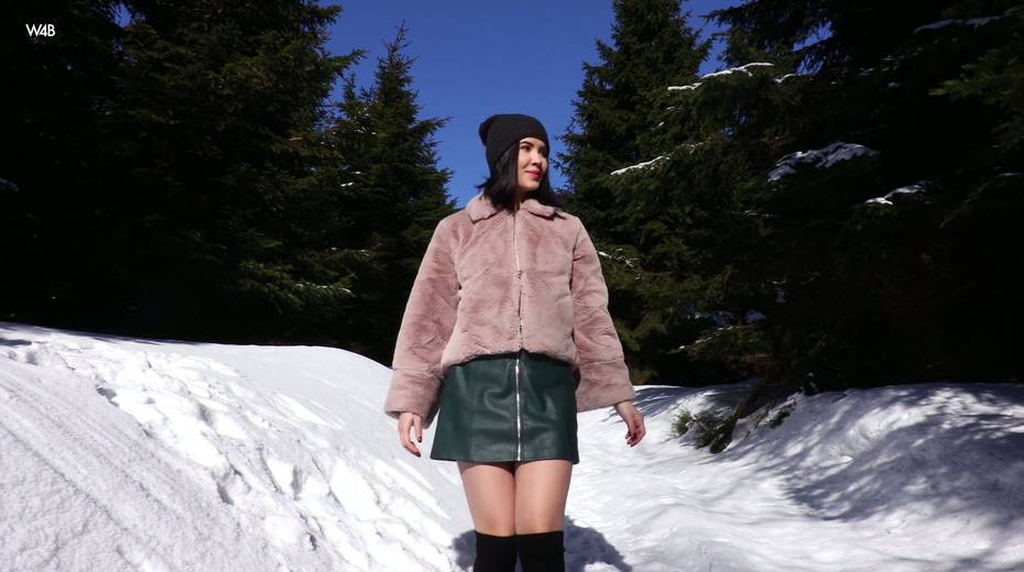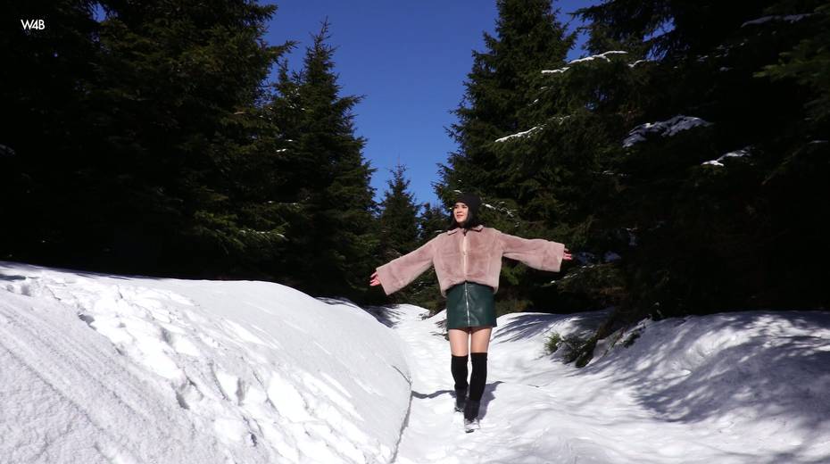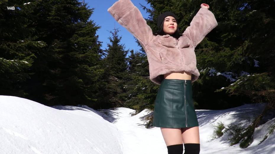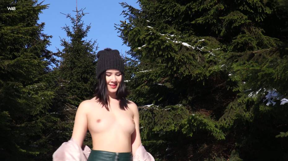 Captivating brunette Lady Dee is playing with her pussy in the snowy mountains