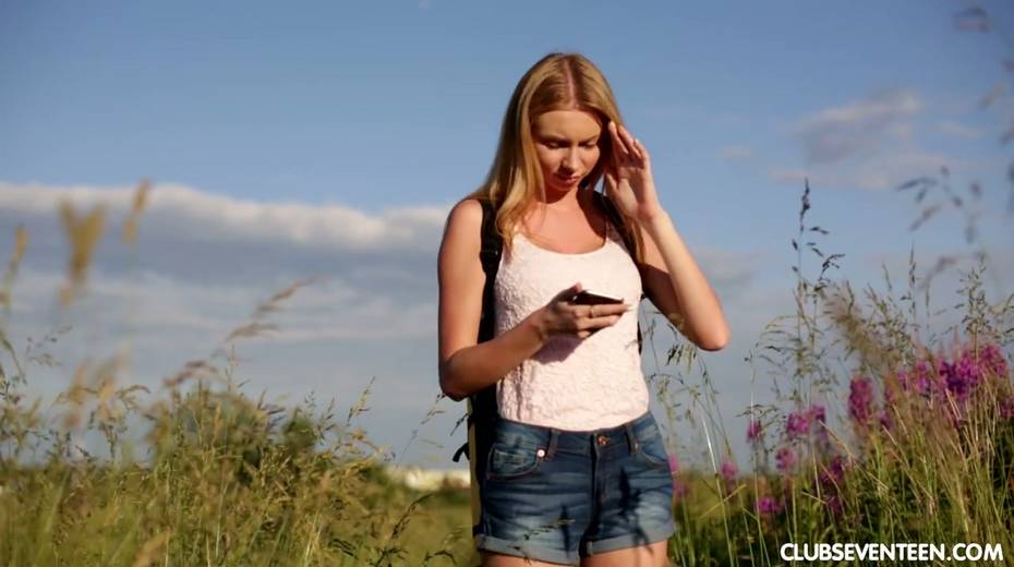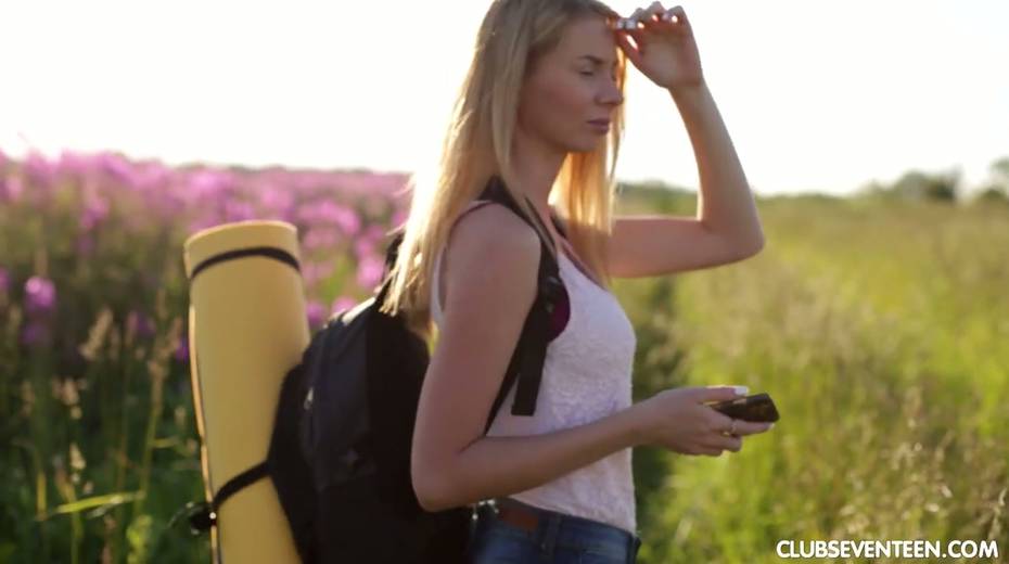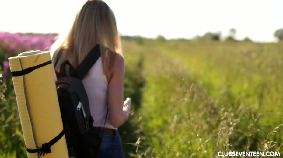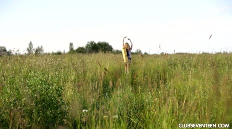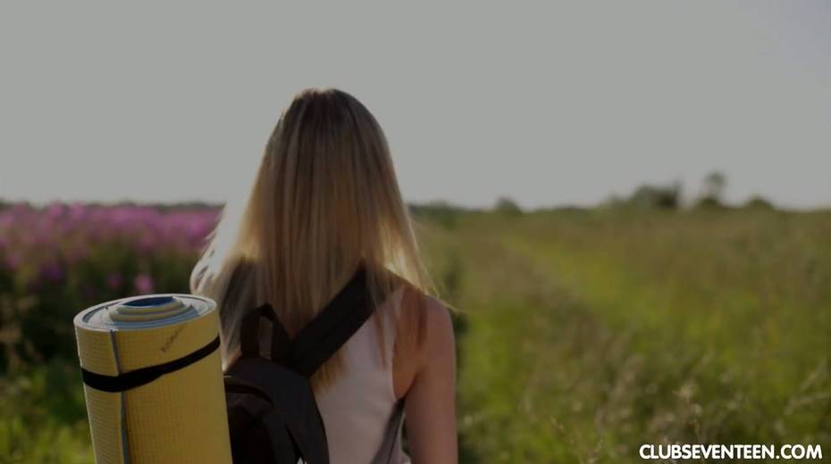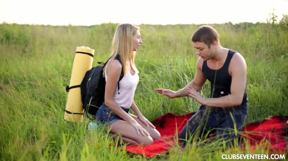 Beautiful girlfriend Kika is making love with her boyfriend in the field at sunset
