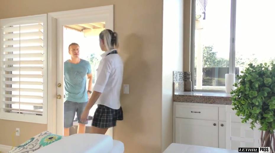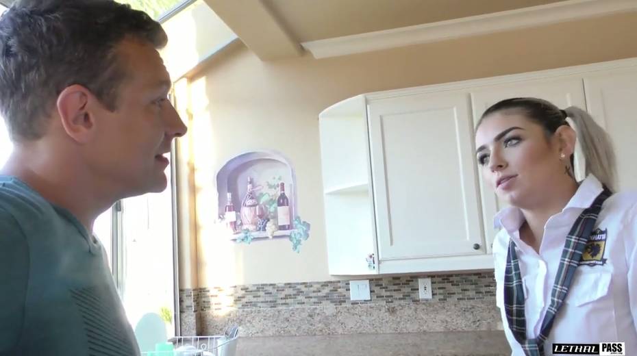 Slender teen in short kilt skirt Aspen Ora gets her pussy finger fucked and rammed hard