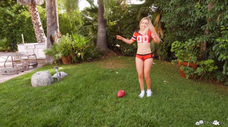 Blond cheerleader Dakota Bleu licks a dick and gets her muff banged