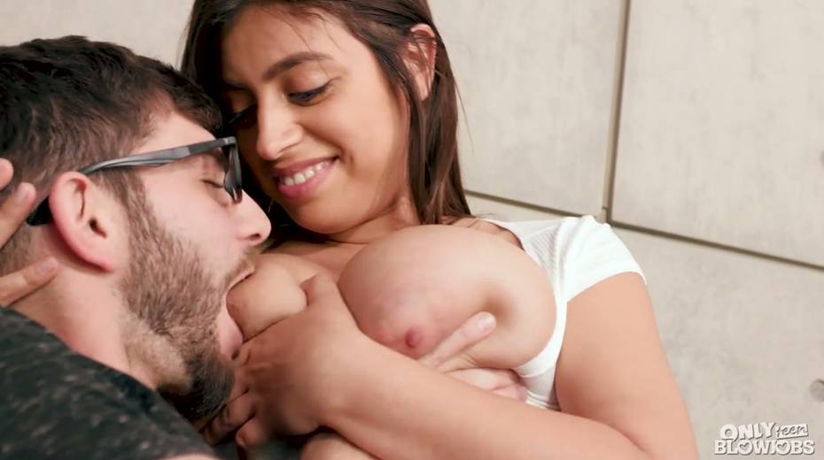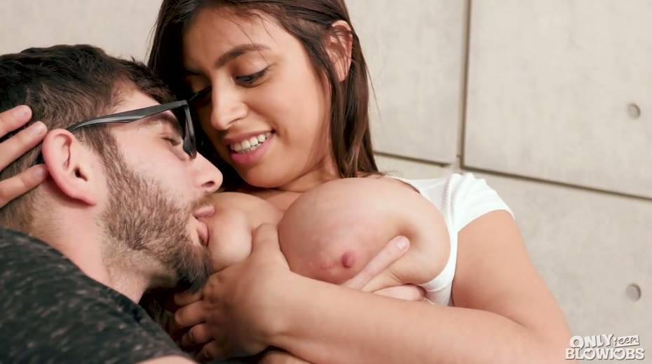 Mega busty babe Ella Knox gives a blowjob and a great titjob