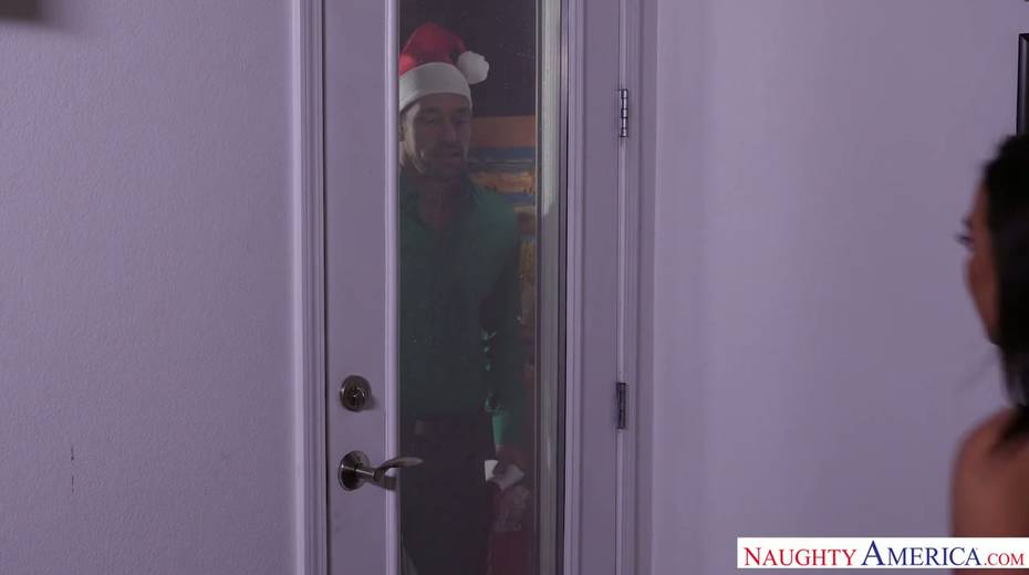 Beautiful chick Amara Romani pleases a dick of her horny boyfriend in santa hat