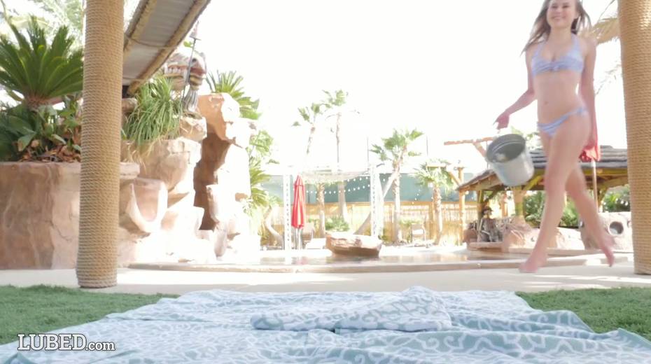 Oiled up babe in sexy bikini Alyssa Cole gets her twat rammed in the garden