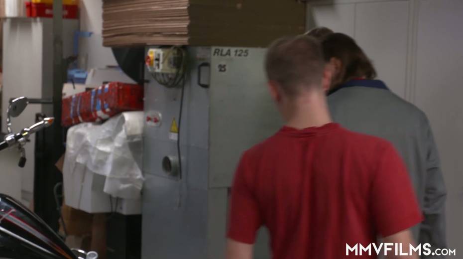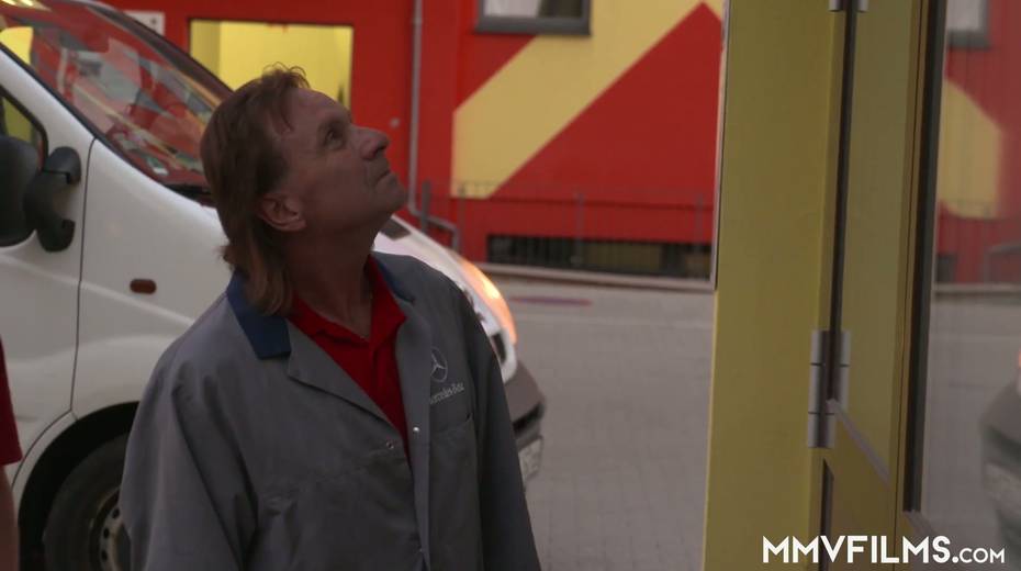 Slim blond bitch Jenny Smart gets intimate with two kinky mechanics
