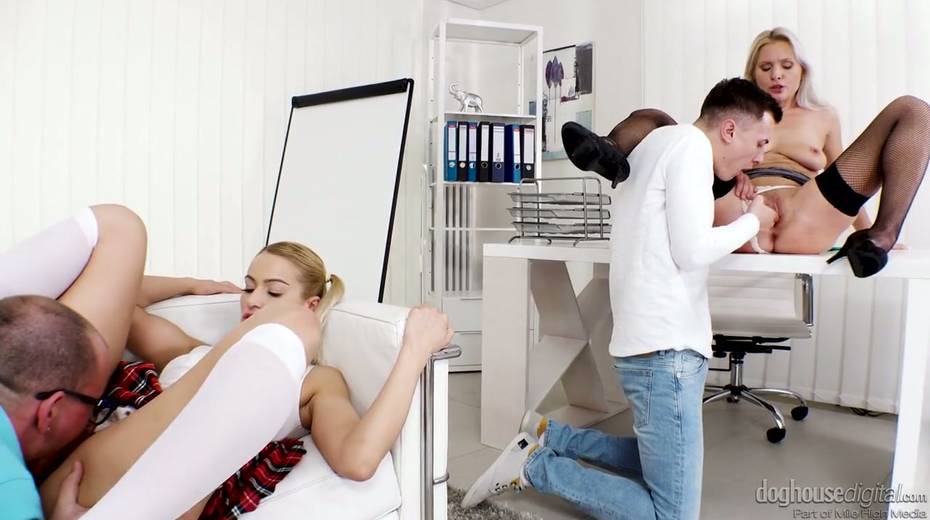 Slutty blonde Kathy Anderson goes wild on a dick while her Gf gets doggy fucked