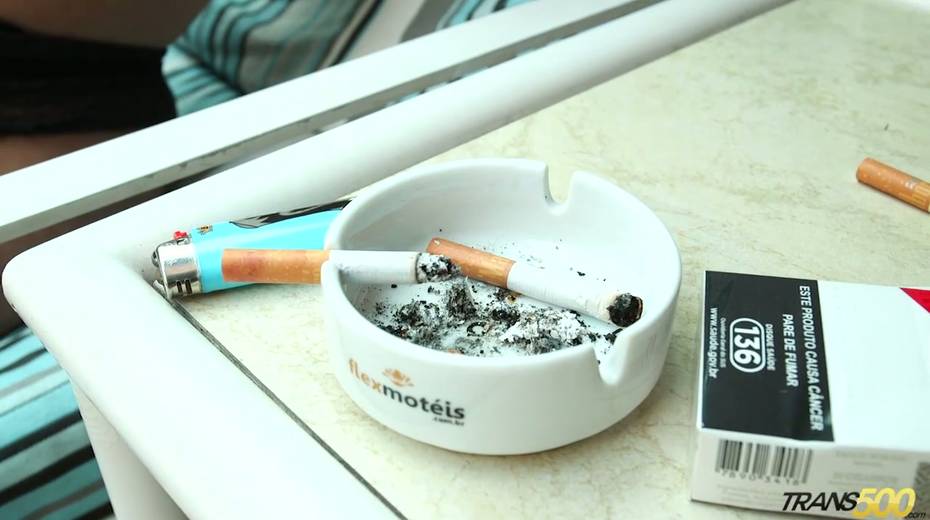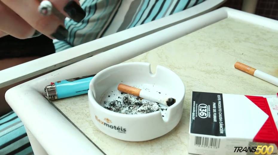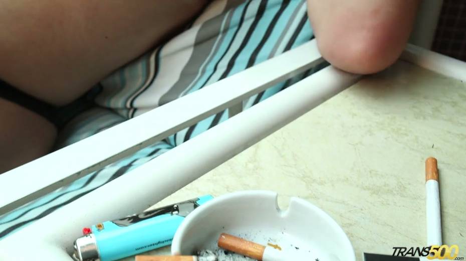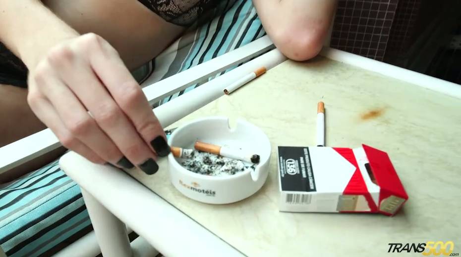 Kinky tattooed tranny is smoking and touching hard perky nipples