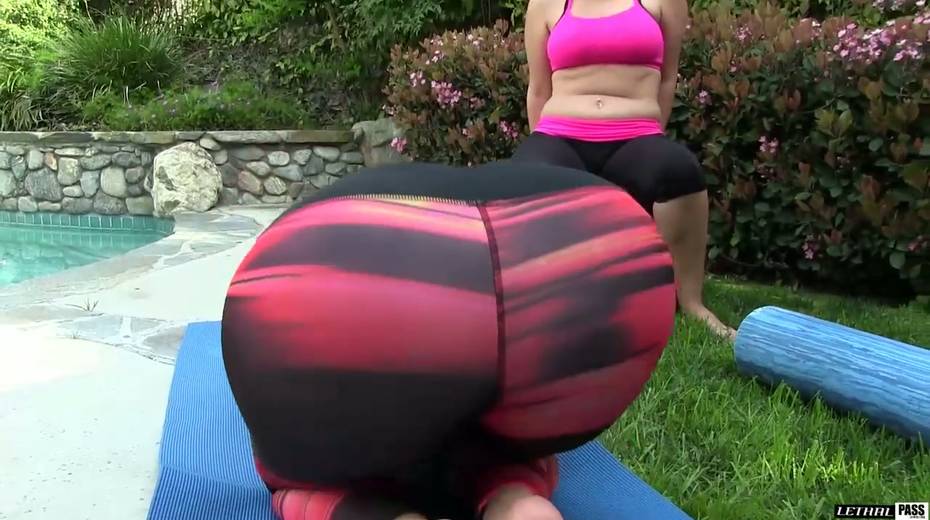 Workout in the garden ends up with crazy lesbian sex on the couch