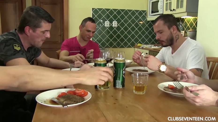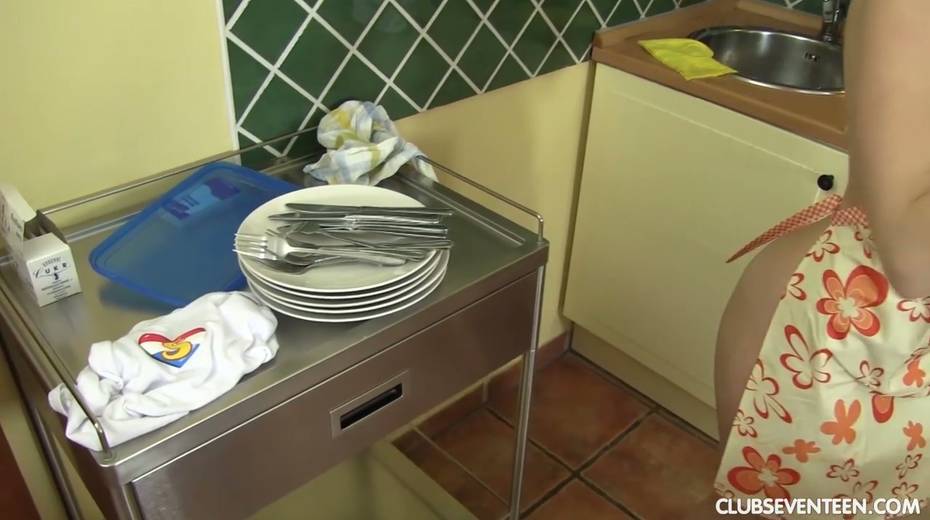 Nude housewife in apron Lady Bug give s blowjob under the table to several guys