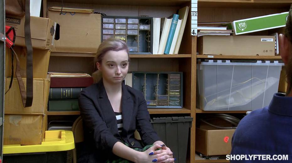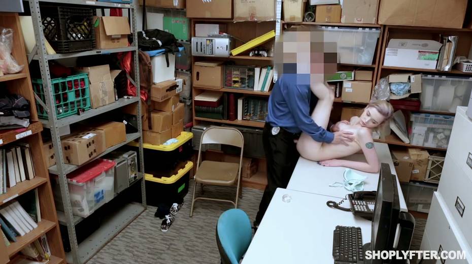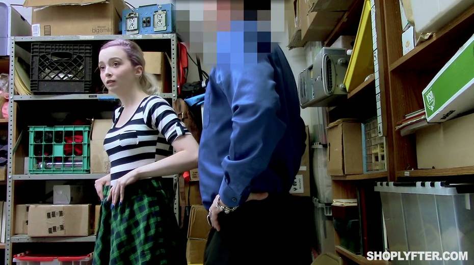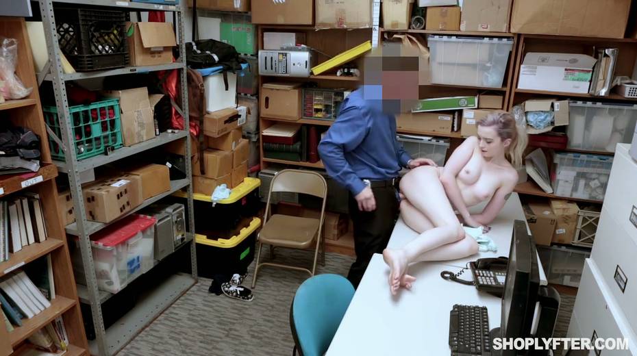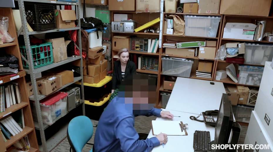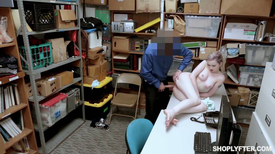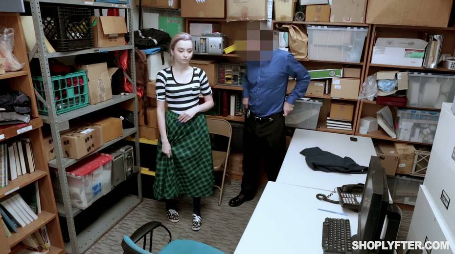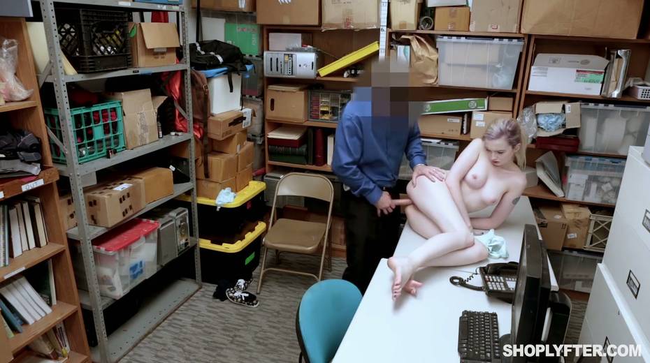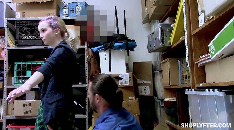 Shoplifting chick Lexi Lore gets her muff and throat punished in the back room
