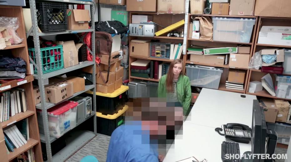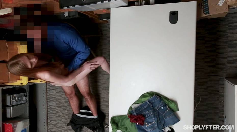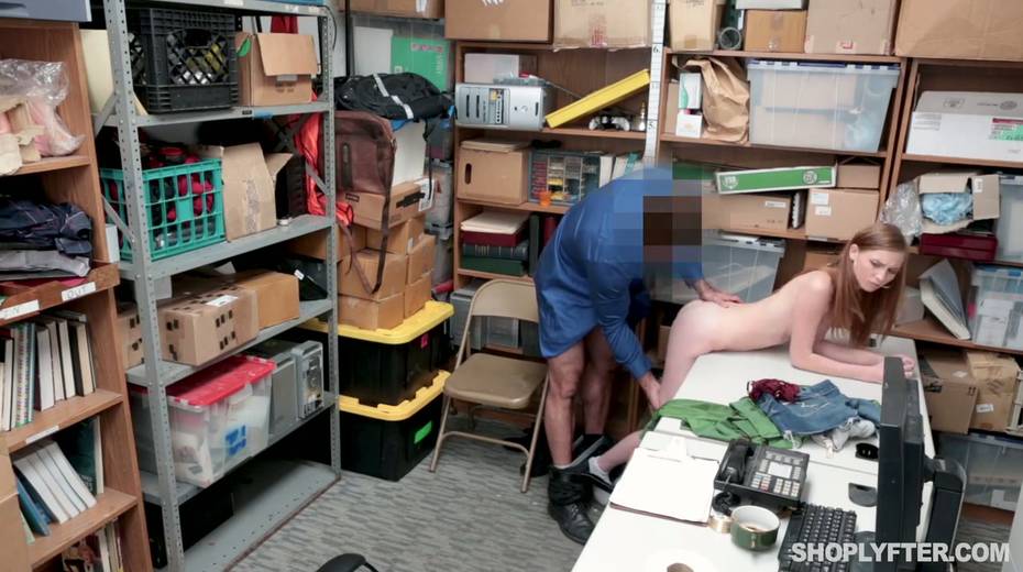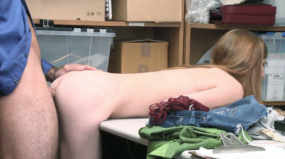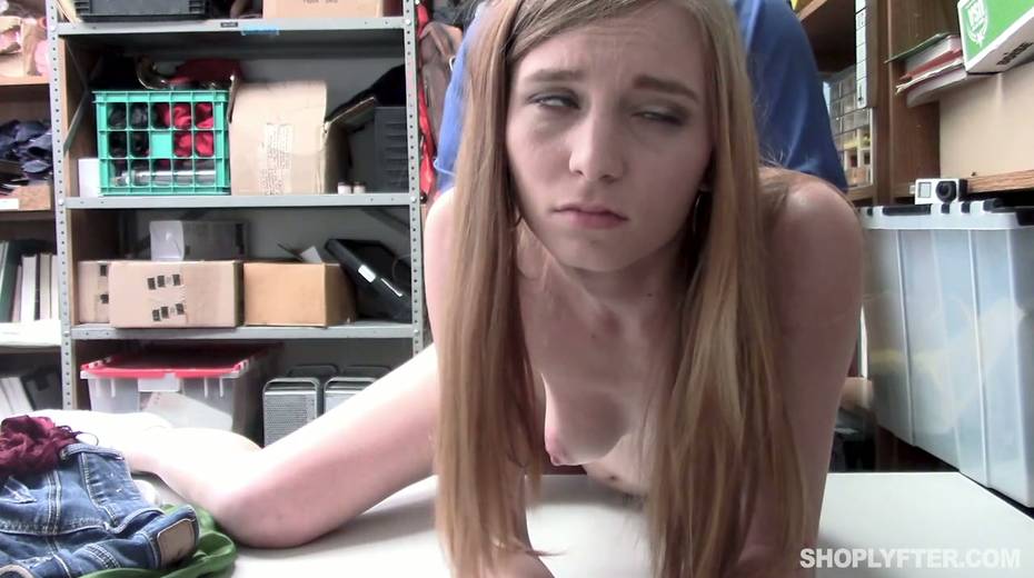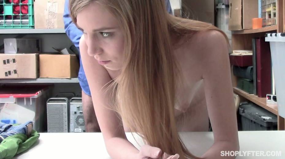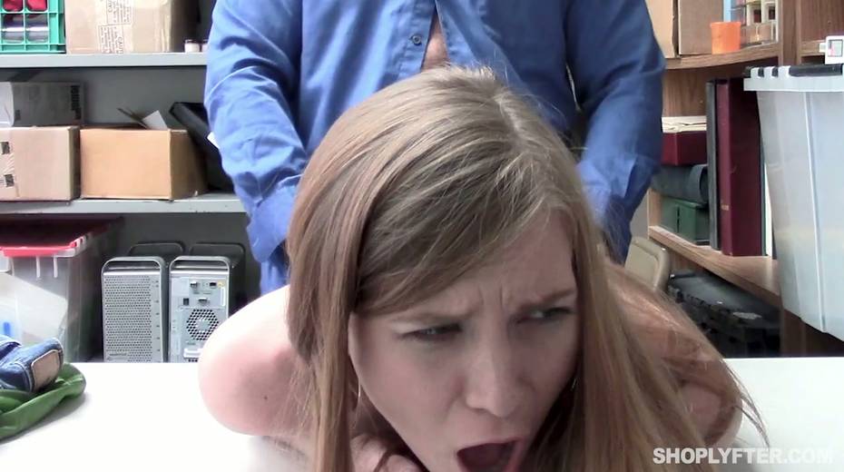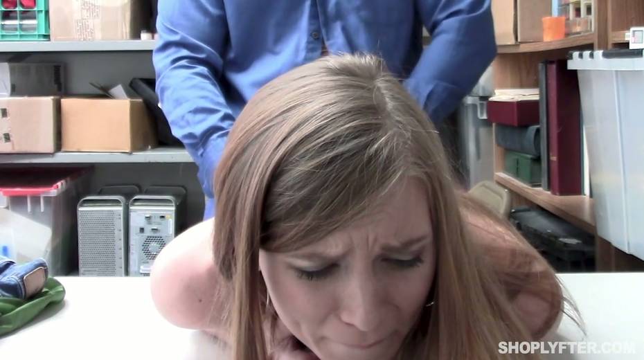 Shoplifting girl Ava Parker gets her pussy fucked right on the table in the back room