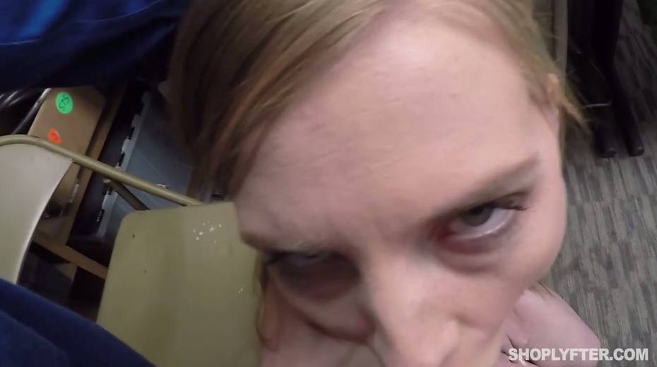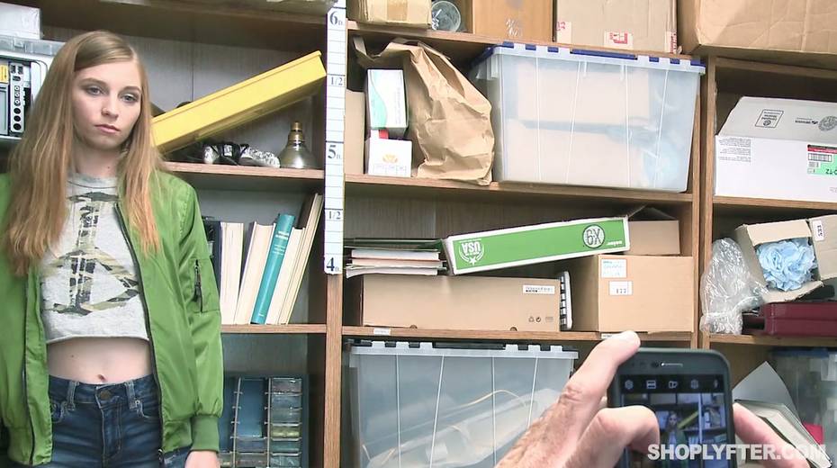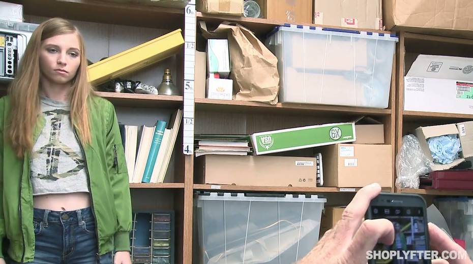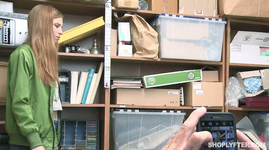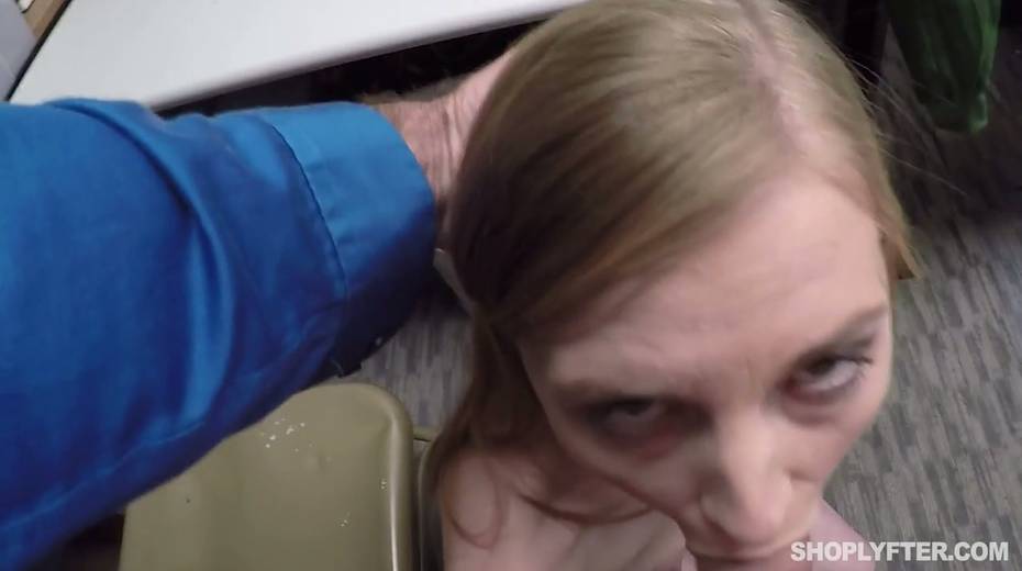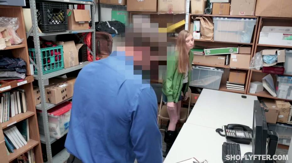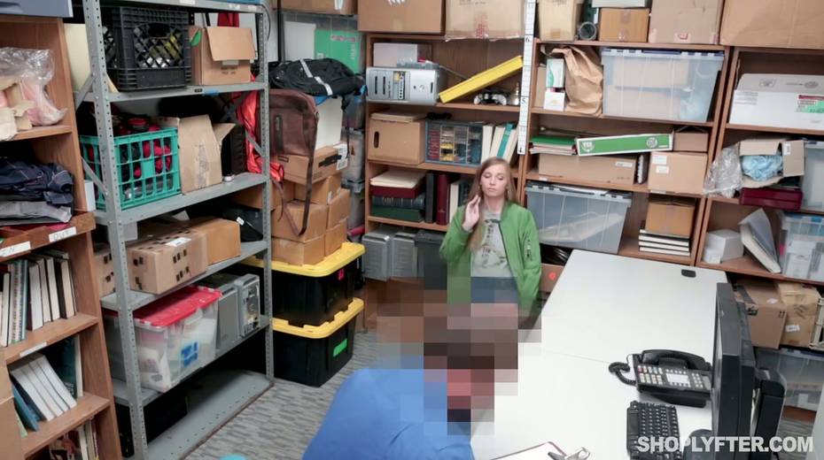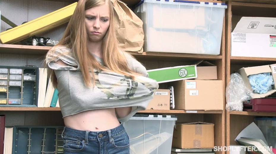 Shoplifting girl Ava Parker gets her pussy fucked right on the table in the back room