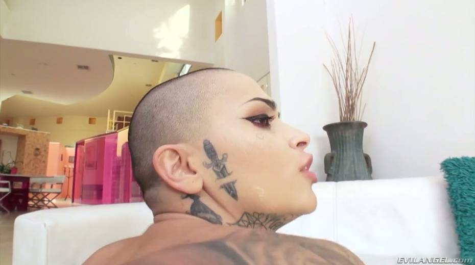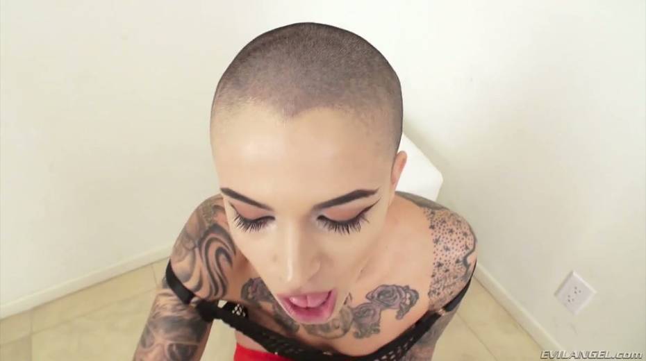 Bald headed tattooed hooker Leigh Raven takes a thick dong in her gaped ass hole