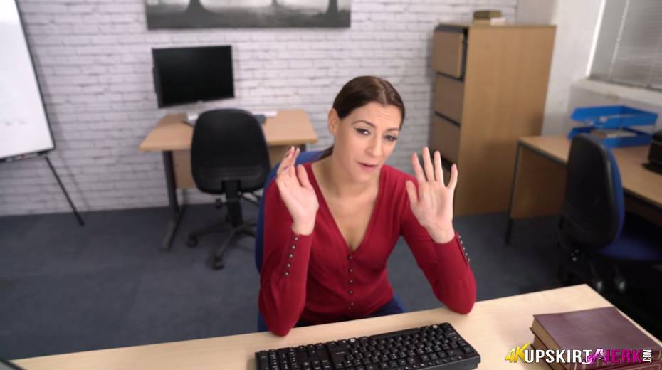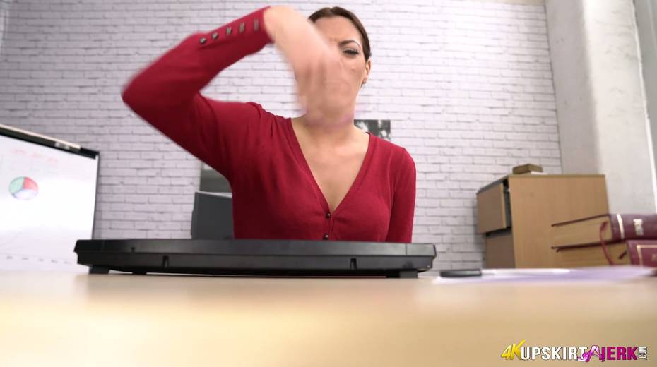 Slutty secretary is masturbating her pussy spreading legs under the table