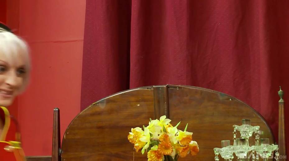 Slut in sexy stockings and uniform Paige Fox serves one dude in the hotel room