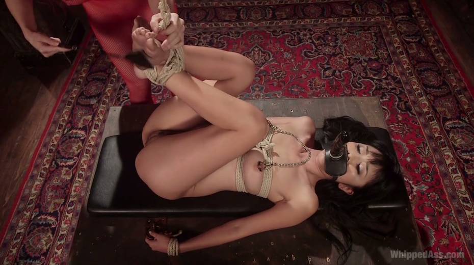Lewd mistress puts on strapon and fucks wet pussy of tited up Japanese whore Marica Hase