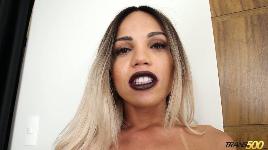 Sassy tranny with tan lines Rebecca Ferraz jerks off her dick